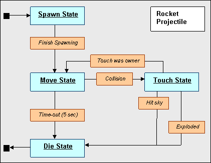 The diagram shows the full life cycle of the rocket projectile within the game. It is interesting to note that the projectile is spawned into existence as the product of an action of another FSM, namely that of the "rocket launcher" from its "fire" action. When the projectile instance dies it is removed from the game, and no longer exists.