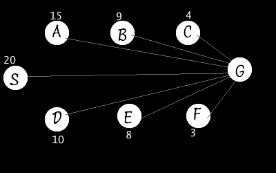 Remove S(20), expand it to S->A(15) and S->D(10). We sort these so the shortest remaining path goes first and add them to the stack. So, our stack is now S->D(10) and S->A(15).